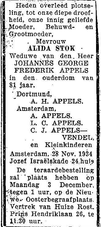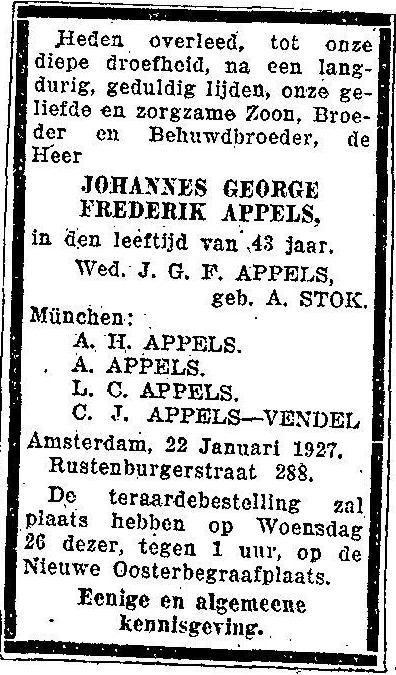 Terwijl Appels zich in Dortmund bevond, overleed op 28 november 1934 zijn moeder op 81-jarige leeftijd in Amsterdam. Het lijkt dat Appels op dat moment niet (meer) gehuwd was.⁴