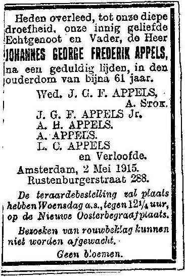 Vader Johannes George Frederik Appels overleed toen Hendrik 29 jaar was na een geduldig ziekbed op 61-jarige leeftijd op 2 mei 1915.⁴