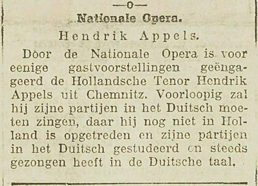 “Hendrik Appels naar Nederland. Berlijn, 7 Nov. – Hendrik Appels, van de groote volksopera alhier, is door de nationale opera in Nederland voor verschillende gastvoorstellingen geëngageerd. (De Telegraaf 8-11-1924)
